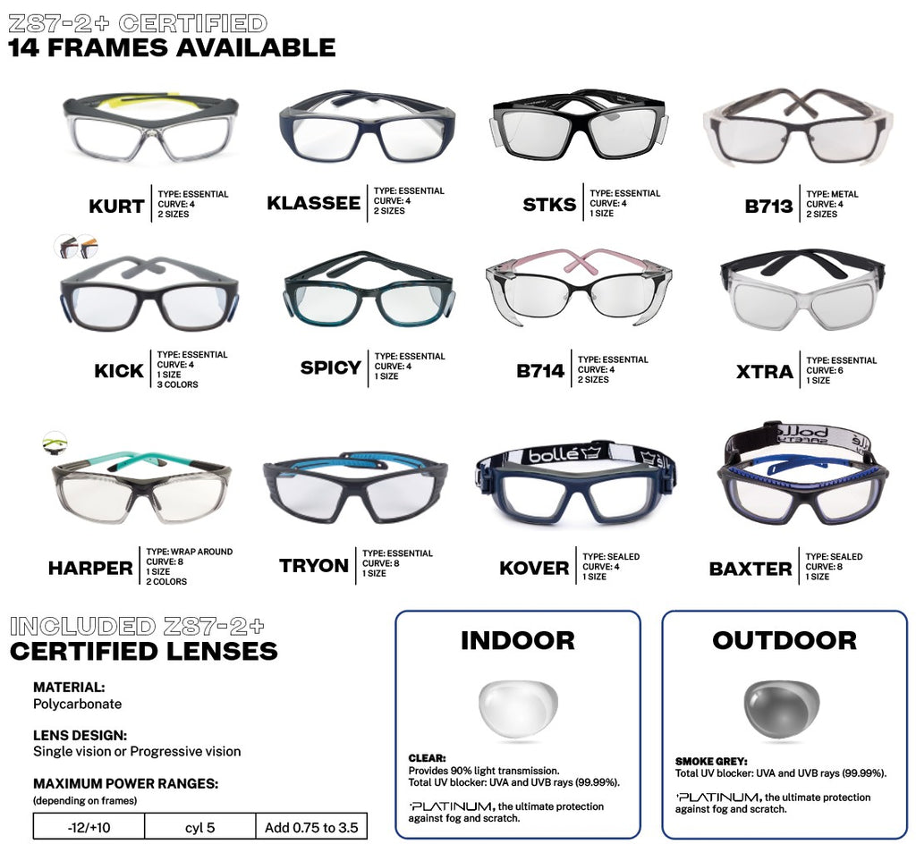 • Choose from a variety of stylish, ANSI Z87-2+ certified frames and lenses.
